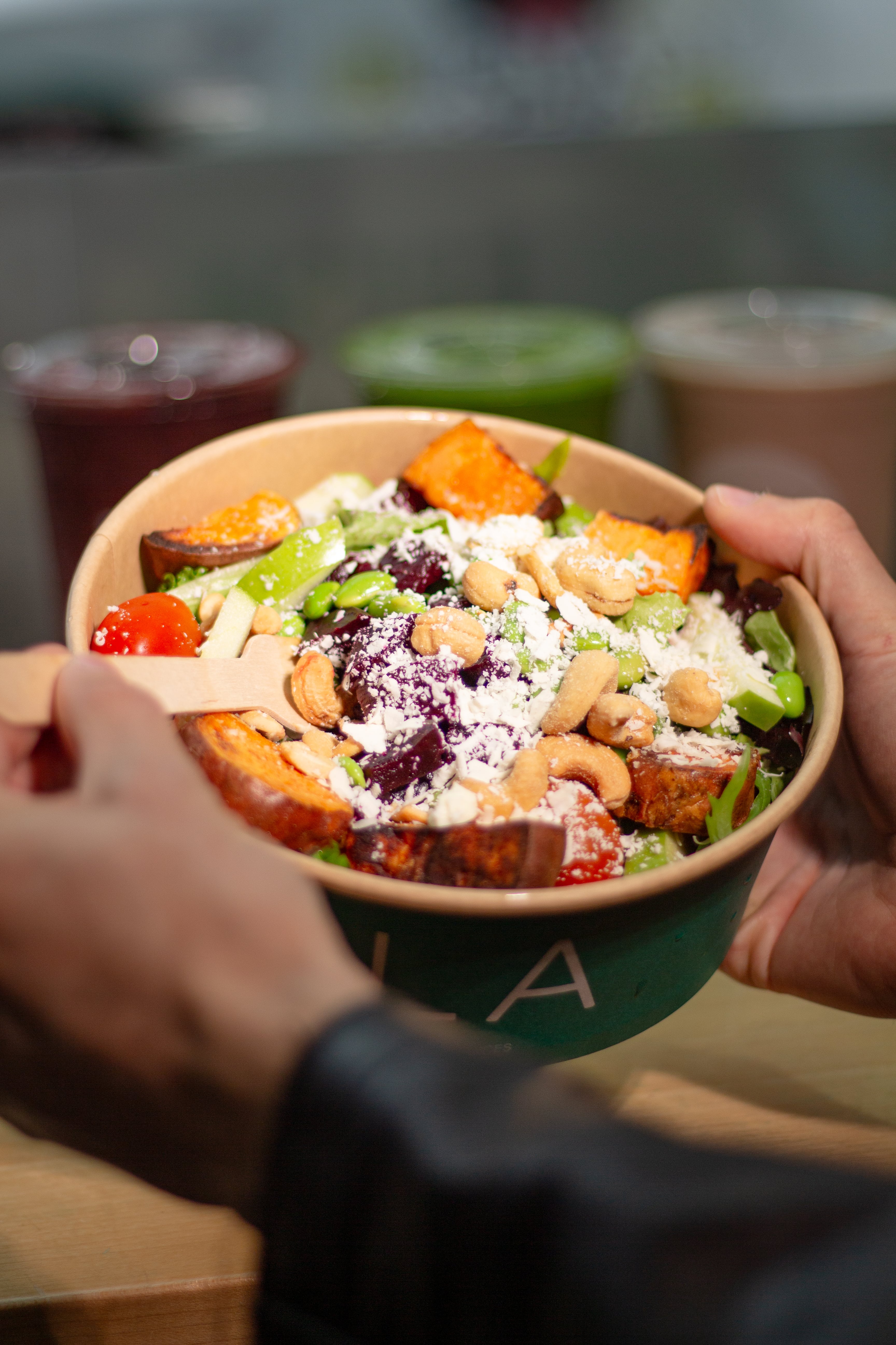 Falafel, roasted beetroot, roasted yam, green apple, spring mix, massaged kale, edamame, roasted cashew, feta cheese, balsamic vinaigrette dressing